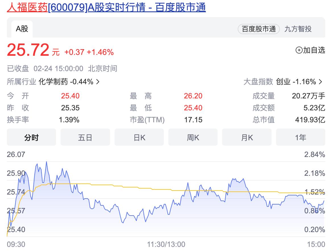 在此背景下,麻醉药龙头企业人福医药(600079)表现抗跌。截至2月24日收盘,人福医药报收于25.72元,上涨1.46%,换手率1.39%,成交量20.27万手,成交额5.23亿元,总市值419.93亿元。